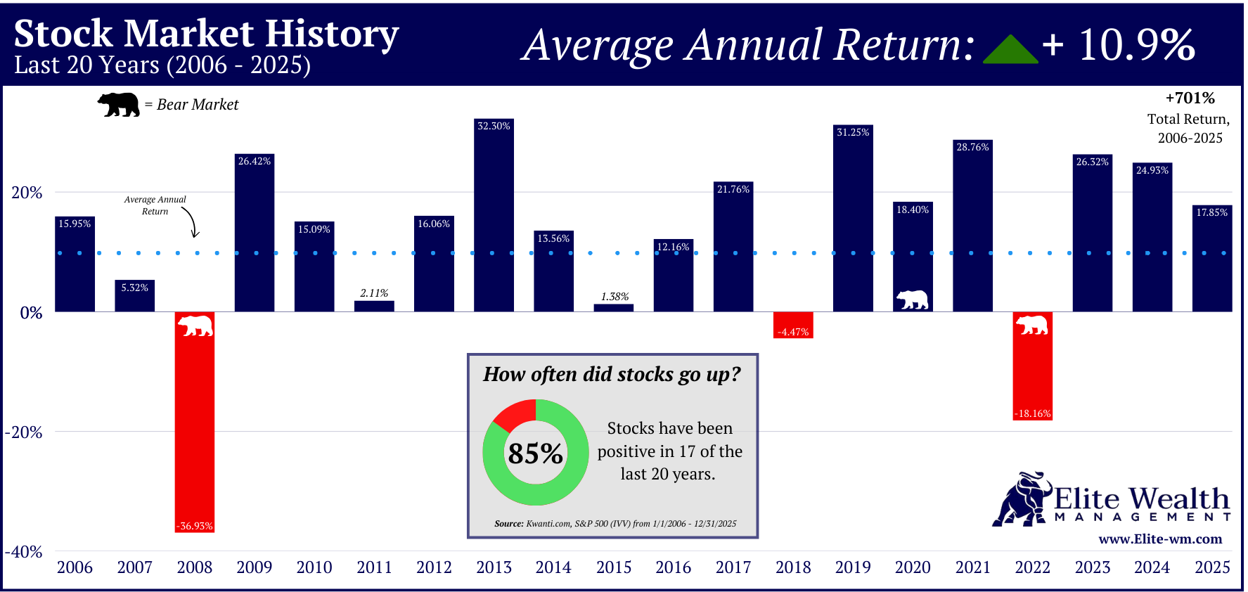 The media loves to compare the stock market to a casino, where fortunes can vanish on a single bad roll. Sure, drops are part of the program—but that doesn't make holding stocks a loser's bet. Stock investing is a proven wealth creation tool that anyone can access. Just look at the numbers: From 2006 to 2025, the S&P 500 posted positive annual returns in 17 out of 20 years, averaging nealy 11% per year. If roulette or blackjack paid like that, Sin City would be a ghost town. This isn't a 50/50 crapshoot—it's an asymmetric growth opportunity for those who invest for the long term.